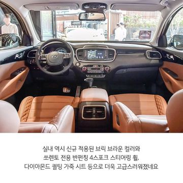 Bên trong không gian nội thất, Kia Sorento 2018 được trang bị tay lái 4 chấu mới, cần số mới, ghế bọc da màu nâu, sạc điện thoại không dây... Về an toàn, xe bao gồm các tình năng như: hỗ trợ duy trì làn đường, kiểm soát hành trình thông minh, hỗ trợ ngăn va chạm trực diện, thông tin điểm mù, đèn chiếu sáng theo góc bẻ lái, cảnh báo tình trạng buồn ngủ của người lái và giám sát áp suất lốp.