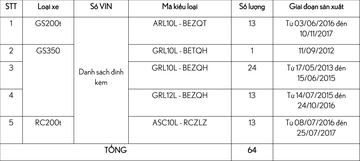 Chương trình dự kiến sẽ được Lexus Việt Nam thực hiện từ ngày 02/02/2023 tại tất cả các Đại lý của Lexus trên toàn quốc. Theo thông tin do Tập đoàn Toyota Nhật Bản (TMC) cung cấp, danh sách và số lượng xe Lexus tại Việt Nam bị ảnh hưởng cụ thể như sau: