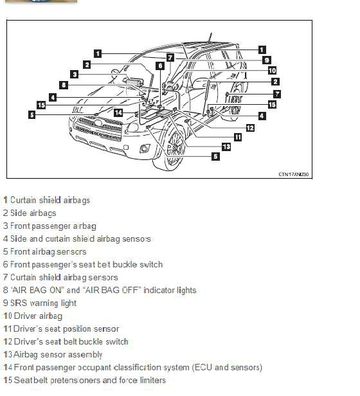 3- Hệ thống an toàn SRS được cấu tạo bởi túi khí, hộp điều khiển – nơi quyết định nổ túi nào, và các cảm biến đo xung động. Trong hình minh họa là cấu tạo hệ thống SRS trên 1 chiếc Toyota Rav4 (sản xuất cách đây hơn 10 năm), với các cảm biến va chạm 2 bên xe, phía trước xe. Vài xe trang bị nghèo nàn chỉ có 1 cảm biến, 1 đến 2 túi khí, nhưng đa số bây giờ các xe đều trang bị khá nhiều cảm biến và túi khí.