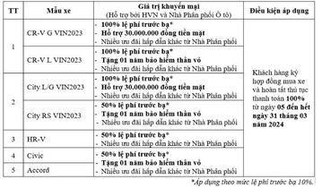 Khách hàng mua HR-V được hỗ trợ 50% lệ phí trước bạ. Đối với khách hàng mua các mẫu Civic và Accord ngoài mức hỗ trợ 50% lệ phí trước bạ còn được tặng 01 năm bảo hiểm thân vỏ, bên cạnh nhiều ưu đãi khác từ phía đại lý.