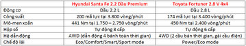 Hyundai Santa Fe 2.2 Premium và Toyota Fortuner 2.8 V đều sử dụng hệ thống chiếu sáng dạng LED gồm đèn pha tự động, đèn định vị ban ngày và đèn hậu. Một điểm khác biệt nhỏ là đại diện Hàn Quốc lăn bánh trên la-zăng hợp kim 19-inch và lốp 235/55R19, đối thủ là loại 18-inch và lốp 265/60R18.
