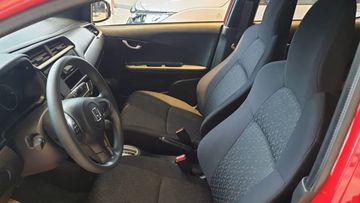 Ghế ngồi trên Brio G được bọc nỉ và không phải là dạng tựa đầu rời mà được nối liền. Hệ thống điều hòa trên bản tiêu chuẩn là loại “chỉnh cơm” nhưng không phải kiểu vặn núm hoặc công tắc thường thấy, mà sử dụng màn hình hiển thị điện tử và thiết kế các chức năng điều chỉnh bằng nút bấm, trông hiện đại và có vẻ cao cấp hơn rất nhiều.