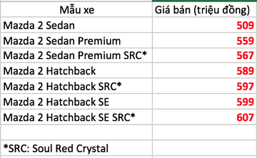 Với Mazda 2 mới, khách hàng có 4 tùy chọn phiên bản (trước đây chỉ 2), bao gồm hai phiên bản sedan với các mức trang bị khác nhau. Bên cạnh đó là 2 phiên bản hatchback với gói trang trí nội thất khác biệt. Giá bán cụ thể của Mazda 2 như sau: