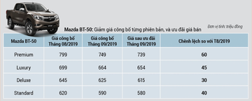 Tháng 09/2019, Thaco chính thức công bố giá bán mới cho tất cả các phiên bản Mazda BT-50 với mức giảm tương đương từ 30 đến 60 triệu đồng. Như vậy, giá bán mới của BT-50 sau ưu đãi kể từ ngày 01/09 chỉ còn từ 580 triệu đồng, mức giá tốt nhất của mẫu xe này từ trước đến nay, và cũng là mức giá cạnh tranh trong phân khúc xe bán tải hiện nay.