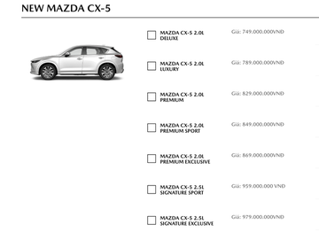 Mazda CX-5 bản mới nhất ra mắt thị trường Việt Nam hồi tháng 7/2023, được thay đổi về kiểu dáng thiết kế, bổ sung thêm nhiều trang bị tiện nghi và an toàn cao cấp. Tất cả các phiên bản đều được trang bị ghế bọc da, ghế lái chỉnh điện nhớ 2 vị trí, ghế phụ chỉnh điện, vô lăng bọc da (tích hợp hệ thống điều khiển và Cruise Control), màn hình giải trí 8 inch, hệ thống điều khiển trung tâm, 10 loa Bose, điều hòa 2 vùng độc lập, phanh tay điện tử tích hợp Auto Hold, màn hình HUD kính lái.