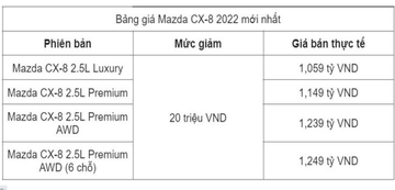 Theo đó, Thaco vừa thông báo sẽ thực hiện chính sách giảm giá đối với tất cả các phiên bản của Mazda CX-8, mức giảm 20 triệu VNĐ. Cụ thể, Mazda CX-8 Luxury có giá 1,059 tỷ VND và bản Premium 1,149 tỷ VND. Mazda CX-8 Premium AWD 7 chỗ có giá 1,239 tỷ VND và phiên bản 6 chỗ là 1,249 tỷ VND.