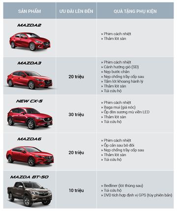 Trong khi đó, Mazda tiếp tục duy trì chương trình ưu đãi trước Tết trong tháng 2 này với mức cao nhất 30 triệu đồng, tặng thêm các bộ phụ kiện tùy theo dòng xe: