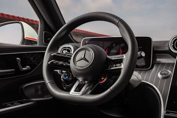 Vô lăng 3 chấu thể thao AMG Performance được bọc da nappa cao cấp với logo Mercedes-Benz và dòng chữ AMG được thiết kế độc quyền, phần dưới bằng phẳng và có lỗ thông gió ở phần tay cầm. Điểm nhấn khác biệt và cũng thu hút nhất trên cụm vô lăng chính là hai nút tròn nổi bật phát sáng, không chỉ làm tăng thêm diện mạo thể thao mà còn hỗ trợ thao tác nhanh.
