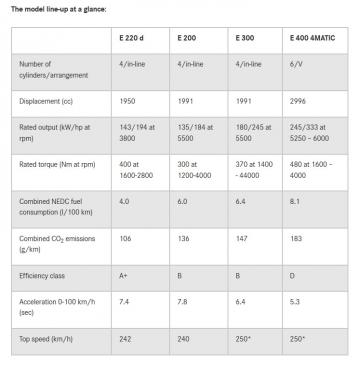 + Bản E200 với động cơ xăng tăng áp 2.0L, cho công suất 181 mã lực và mô-men xoắn cực đại 300 Nm.
