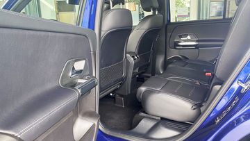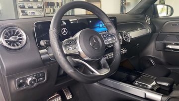 Bên trong khoang nội thất, GLB 200 AMG được ưu ái ốp vân sợi carbon ở mặt tap lô và bệ cửa. Vật liệu hợp kim cũng được sử dụng ở bệ trung tâm, các khe gió và phím bấm, mang đến sự hiện đại ở hàng ghế trước. Vô lăng thể thao bọc da Nappa của GLB có thiết kế đáy phẳng, tích hợp 2 nút điều khiển cảm ứng (Touch Control Buttons), giúp người lái dễ dàng điều khiển các tính năng của xe mà không bị sao nhãng. Tính năng Ga tự động (Cruise Control), Giới hạn tốc độ (Speed Limit) được tích hợp lên tay lái.