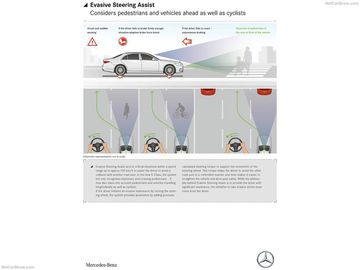‑ Hệ thống hỗ trợ đánh lái tránh va chạm: Hỗ trợ khi người lái có thao tác khẩn cấp để tránh va chạm với vật thể khác ở tốc độ dưới 108 km/h. Trên S-Class, hệ thống có thể nhận diện được người đi bộ đứng yên hoặc đang sang đường, thậm chí cả xe đạp đang băng ngang.