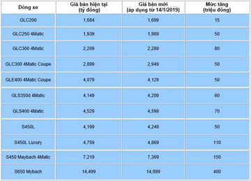 Dòng GLS tăng giá biến thể GLS 350d 4Matic và GLS 400 4Matic với mức tăng lần lượt là 60 triệu đồng và 70 triệu đồng. Duy nhất dòng GLE chỉ tăng giá cho mẫu GLE 400 4Matic Coupe với mức tăng 50 triệu đồng.