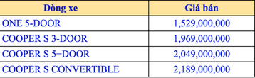 Thế hệ xe MINI 2019 mới nhất được Thaco công bố với giá thấp nhất tầm 1,529 tỷ đồng. Các dòng xe hiện tại được nhập khẩu nguyên chiếc cùng giá bán cụ thể như sau: