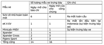 Đồng thời, tại triển lãm, Mitsubishi Motors sẽ trưng bày eK X EV, mẫu xe kei-car3 chạy hoàn toàn bằng điện, lần đầu tiên ra mắt bên ngoài thị trường Nhật Bản, cùng Minicab-MiEV, phiên bản thương mại của mẫu xe điện kích thước nhỏ (EV) kei-car, được lên kế hoạch sản xuất nội địa tại Indonesia. Công ty cũng trưng bày các mẫu xe được bán tại thị trường Indonesia, bao gồm mẫu xe MPV Xpander và Xpander Cross, cũng như dòng SUV cỡ trung Pajero Sport.