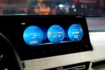 Phần hiển thị cụm ba đồng hồ tái hiện hình ảnh quen thuộc trên mẫu xe Pajero huyền thoại, kết hợp thông tin tọa độ, góc nghiêng cũng như phương hướng giúp tăng thêm niềm vui khi cầm lái.