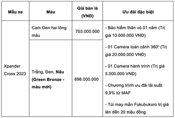 Xpander Cross 2023 sẽ chính thức có mặt tại Nhà phân phối từ ngày 27/02/2023 giá bán từ 698 triệu đồng với 4 màu: Cam Đen (2 tông màu), Trắng, Đen, và Nâu (Green Bronze, màu mới) và bộ quà tặng có tổng giá trị lên đến 35 triệu đồng bao gồm: một năm bảo hiểm thân vỏ, camera hành trình và camera toàn cảnh 360º.