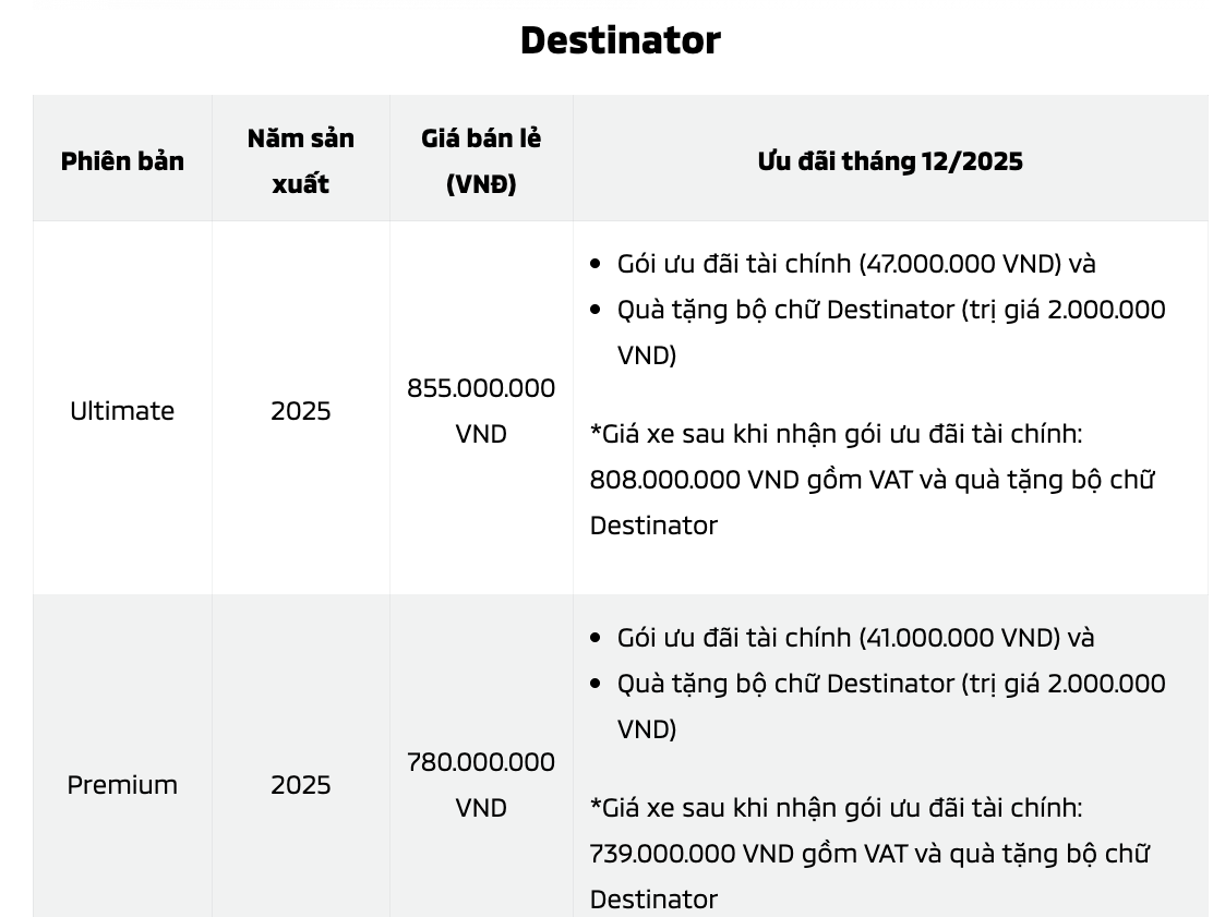 Mitsubishi Motors Việt Nam chính thức giới thiệu mẫu xe Mitsubishi Destinator với 2 phiên bản cùng mức giá bán khởi điểm cực tốt từ 739 đến 808 triệu đồng trong tháng 12/2025.MForce Việt Nam ra mắt 3 mẫu xe tại showroom hoàn toàn mới
