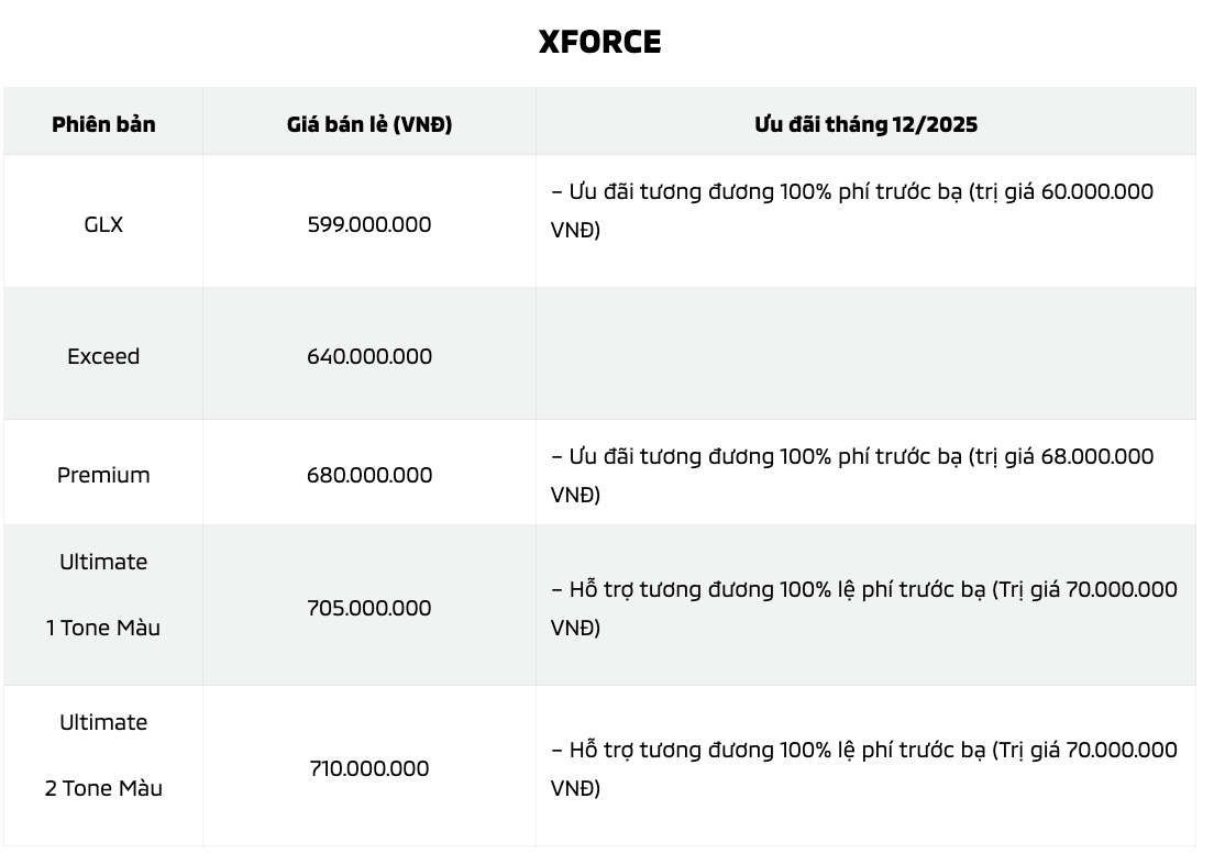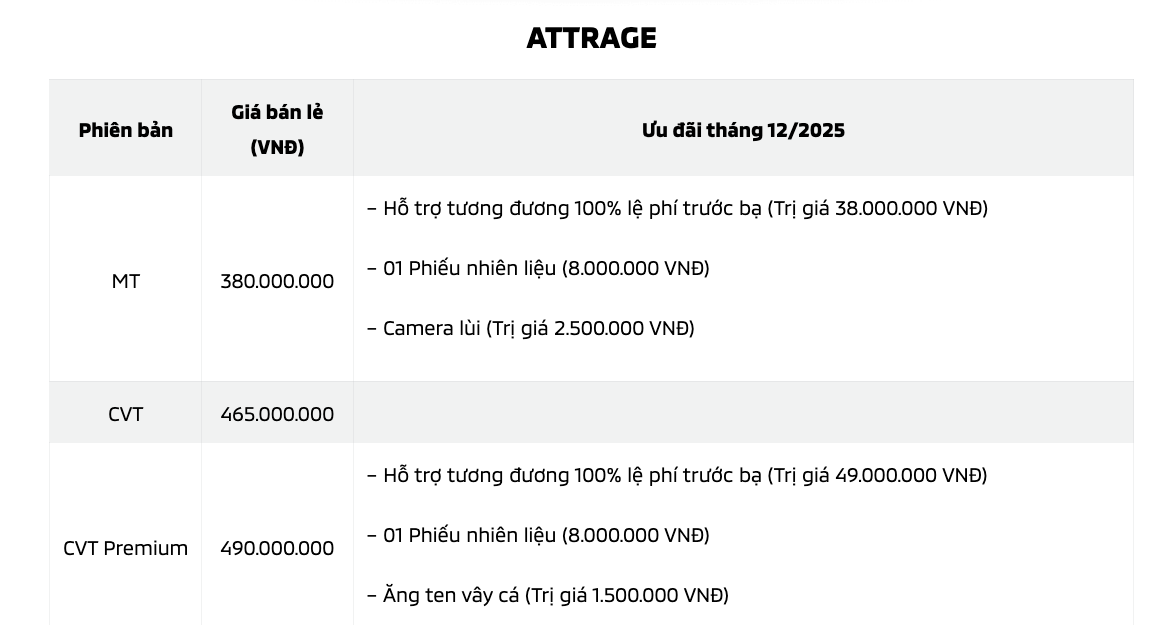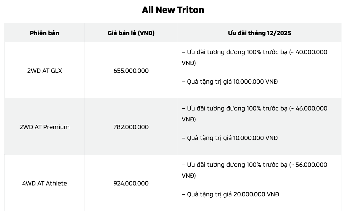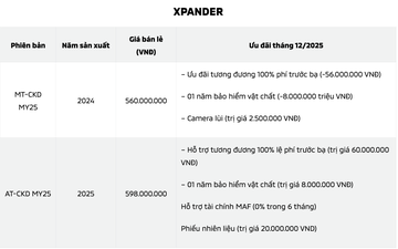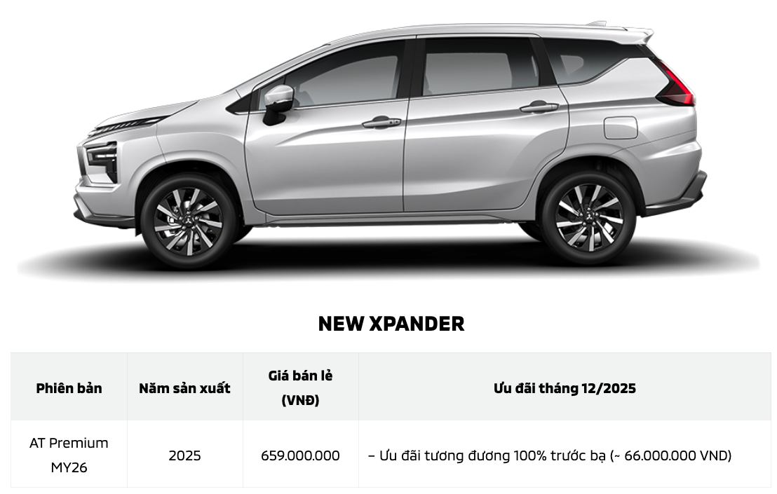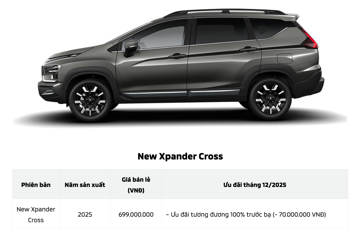 Ngoài ra, cũng trong tháng 12, khách hàng mua xe tại hệ thống NPP của Mitsubishi Motors Việt Nam sẽ nhận ngay ưu đãi 100% lệ phí trước bạ áp dụng cho Xpander, Xpander Cross, Xforce, Attrage và All-New-Triton cùng ưu đãi tài chính đặc biệt cho Destinator.