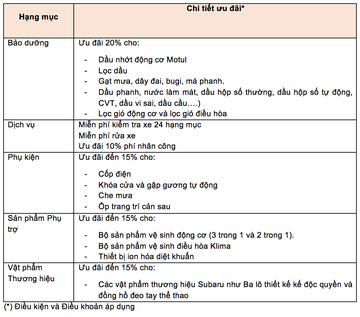 Các khách hàng Subaru trên toàn quốc sẽ được nhận nhiều ưu đãi đặc biệt của chương trình Kansha để chăm sóc và bảo dưỡng cho chiếc xe của mình tại các trung tâm dịch vụ ủy quyền của Subaru. Chi tiết ưu đãi cho các sản phẩm, dịch vụ hậu mãi tại các trung tâm dịch vụ Subaru: