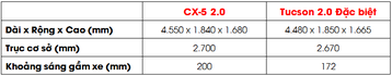 Về kích thước, Mazda CX-5 dài hơn 70 mm, rộng hơn 10 mm và cao hơn 15 mm so với Hyundai Tucson. Bên cạnh đó, khoảng sáng gầm xe còn cao hơn 28 mm giúp CX-5 vượt trội hơn khi leo lề hoặc đi các địa hình khó. Ngoài ra, CX-5 cũng sở hữu chiều dài trục cơ sở tốt hơn 30 mm so với đối thủ Hàn Quốc, qua đó mang đến nhiều không gian hơn cho khoang cabin. Trong khi đó, với kích thước nhỏ hơn, Tucson lại mang đến khả năng xoay sở tốt hơn trong nội đô đông đúc.