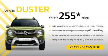 Từ ngày 21/11/2016 - 31/12/2016, chỉ từ 255 triệu đồng khách hàng sẽ sở hữu ngay xe Renault Duster, tương đương 30% giá trị xe, 70% còn lại ngân hàng sẽ hỗ trợ (từ 12 đến 72 tháng). Renault sẽ hỗ trợ 18 tháng lãi suất tương đương 60 triệu đồng.