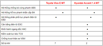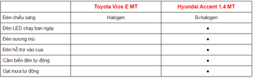 Hyundai Accent 1.4 MT tuy có giá rẻ hơn 61 triệu nhưng danh sách trang bị lại nhỉnh hơn hẳn Toyota Vios E MT. So với các đối thủ số sàn khác trong phân khúc thì Accent cũng gần như đứng đầu về option. Kết hợp với thiết kế hiện đại, trẻ trung, mẫu sedan Hàn Quốc phù hợp với khách hàng trẻ, mong muốn giảm nhẹ chi phí mua xe, không quan tâm đến vấn đề thương hiệu và giá trị bán lại mà chú trọng hơn về phương diện tiện nghi.