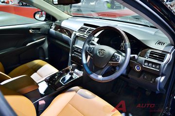 Không gian nội thất cũng không có nhiều thay đổi, nhà sản xuất chỉ áp dụng tùy chọn màu mới cho khách hàng. Các trang bị nổi bật bên trong cabin của Camry tại thị trường này bao gồm: vô-lăng đa chức năng 3 chấu thể thao bọc da, màn hình 4.2 inch, bảng điều khiển trung tâm tái thiết kế với nút điều chỉnh hệ thống điều hòa không khí bố trí sang 2 bên trái và phải. Ngoài ra còn phải kể đến đầu đĩa DVD, hệ thống định vị, cổng USB, dàn âm thanh JBL 12 loa, sạc điện thoại không dây, Smart Key, gương chiếu hậu tự động...
