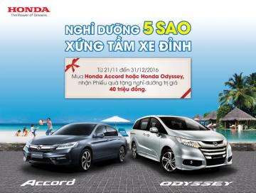 Từ ngày 21/11/2016 đến hết ngày 31/12/2016, Honda Việt Nam thực hiện chương trình khuyến mại hấp dẫn: “Nghỉ dưỡng 5 sao - Xứng tầm xe đỉnh” dành riêng cho Honda Accord và Honda Odyssey.