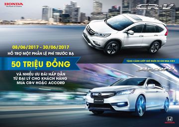 Với mong muốn nhiều khách hàng hơn nữa có cơ hội sở hữu và trải nghiệm hai mẫu xe này, từ ngày 08/06/2017 đến hết ngày 30/06/2017, Honda Việt Nam triển khai trương trình hấp dẫn “Khuyến mại dành cho khách hàng mua xe Honda CR-V và Honda Accord”.