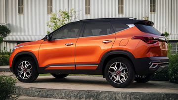 Phần hông xe nổi bật với bộ la-zăng 17 inch đa chấu lạ mắt. Viền chân kính mạ chrome vuốt lên ở trụ D cũng là một chi tiết độc đáo nữa trên Seltos, vừa có tác dụng trang trí, vừa tạo ranh giới tự nhiên giữa thân xe và đuôi xe. Phần viền cửa này phát huy tác dụng tốt nhất trên các tùy chọn 2 tone màu với mui sơn đen.