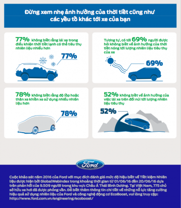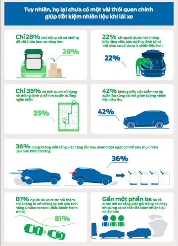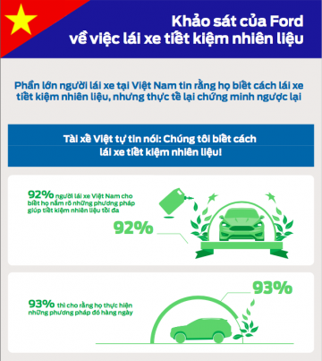 Trong một bài khảo sát gần đây của Công ty Ford Motor, 774 người dùng xe Việt Nam được hỏi về thói quen lái xe cũng như kiến thức về tiết kiệm nhiên liệu. Trong số đó có 92% người lái xe Việt Nam cho biết họ nắm rõ những phương pháp giúp tiết kiệm nhiên liệu tối đa, và 93% thì cho rằng họ thực hiện những phương pháp đó hàng ngày.