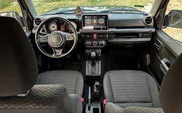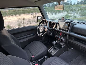 Bước vào bên trong, khoang cabin của Suzuki Jimny hướng đến tính ứng dụng cao thay vì sự sang trọng. Xe trang bị màn hình giải trí cảm ứng 9 inch, điều hòa tự động, ga tự động cùng các cổng kết nối cơ bản. Một chi tiết đầy thú vị là tay nắm ngang trên táp-lô, giúp hành khách dễ dàng bám chặt khi đi qua địa hình gồ ghề.