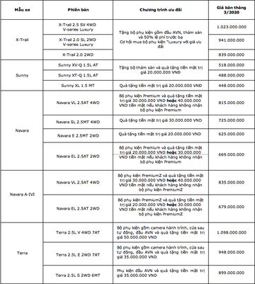 Nhằm đáp lại sự ủng hộ của quý khách hàng dành cho các sản phẩm của Nissan, từ nay đến hết ngày 31/3/2020, Nissan Việt Nam (NVL) triển khai chương trình ưu đãi dành cho khách hàng mua xe Nissan với quà tặng tiền mặt giá trị và các gói quà tặng phụ kiện hấp dẫn.