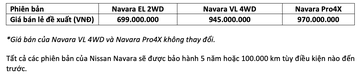 Với việc ra mắt phiên bản mới, Nissan Navara sẽ có tổng cộng 03 phiên bản với giá bán lẻ đề xuất đã bao gồm VAT như sau: