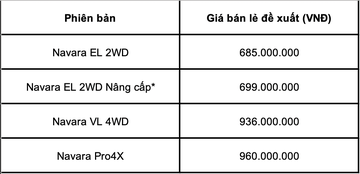 Nissan Navara sẽ có 3 phiên bản chính thức bao gồm Nissan Navara Pro4X, Nissan Navara VL 4WD và Nissan Navara EL 2WD. Ngoài ra, khách hàng sẽ có thêm 1 tùy chọn nâng cấp cho phiên bản Navara EL 2WD.