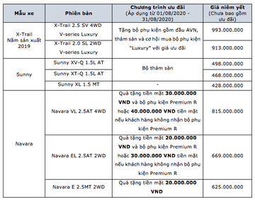 Bên cạnh việc đưa ra giá ưu đãi đặc biệt của Nissan Sunny, từ 01/08/2020 - 31/08/2020, Nissan Việt Nam vẫn tiếp tục đưa ra các gói quà tặng tiền mặt và phụ kiện hấp dẫn dành cho khách hàng lựa chọn các mẫu xe Nissan. Chi tiết chương trình như sau: