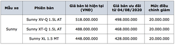 Theo đó giá ưu đãi đặc biệt của mẫu xe này sẽ được điều chỉnh giảm 20 triệu cho 3 phiên bản, Nissan Sunny XV-Q 1.5L AT, Nissan Sunny XT-Q 1.5L AT và Nissan Sunny XL 1.5 MT. Bên cạnh đó, thương hiệu Nhật Bản cũng đồng thời tung ra các gói quà tặng tiền mặt và phụ kiện dành cho khách hàng mua xe Nissan trong tháng 8/2020.
