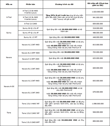 Theo đó, khách hàng mua xe trong thời điểm này sẽ nhận được quà tặng tiền mặt giá trị và các gói quà tặng phụ kiện hấp dẫn. Chương trình được áp dụng cho tất cả các dòng xe Nissan đang được phân phối chính thức tại Việt Nam bao gồm Nissan Terra, Nissan Navara, Nissan X-Trail và Nissan Sunny với mức ưu đãi khác nhau tùy theo từng dòng xe.