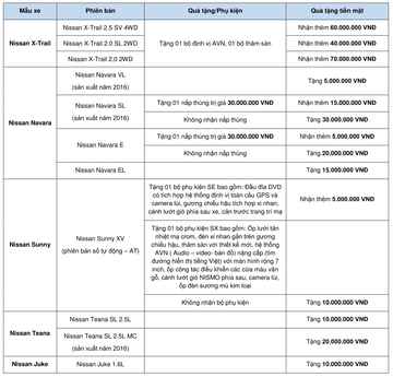 Tiếp nối những ưu đãi dành cho khách hàng trong tháng Hai vừa qua, Nissan Việt Nam tiếp tục triển khai và mở rộng chương trình khuyến mãi. Cụ thể năm dòng của Nissan gồm có Sunny, Teana, X-Trail, Juke và NP300 Navara sẽ có các ưu đãi bằng hiện vật cùng hiện kim khác nhau. Cụ thể như sau: