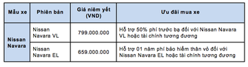 Khi mua xe Nissan Navara, khách hàng sẽ được tặng 50% thuế trước bạ hoặc 1 năm bảo hiểm vật chất hay trừ vào giá bán xe.