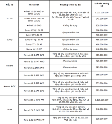 Theo đó từ nay đến hết ngày 31/10/2019, khi mua các sản phẩm ô tô Nissan gồm Nissan Terra, Nissan Navara, Nissan X-Trail và Nissan Sunny tại hệ thống các đại lý Nissan chính hãng trên toàn quốc, ngoài các quà tặng phụ kiện hấp dẫn, khách hàng sẽ được nhận ngay quà tặng tiền mặt với mức giá trị khác nhau tùy theo từng dòng xe.
