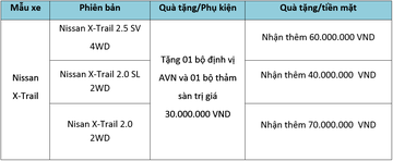 Theo đó, từ ngày 13/02/2017 đến ngày 28/02/2017, TCIEV khách hàng chọn mua xe X-Trail sẽ nhận được bộ quà tặng bao gồm đồng tiền mặt từ 40 đến 70 triệu đồng tùy theo phiên bản cùng bộ định vị AVN trị giá 30 triệu đồng kèm bộ thảm trải sàn. Chi tiết như sau: