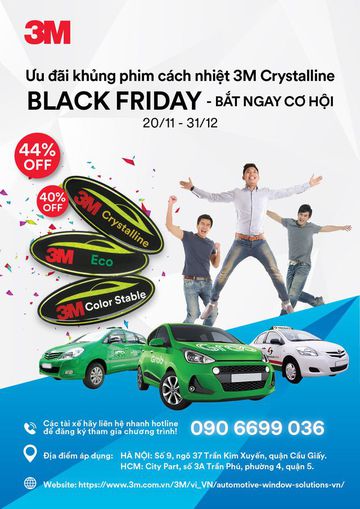 Nhân dịp Black Friday, 3M tung chương trình ưu đãi đặc biệt dành riêng cho các tài xế taxi, giảm trên 40% cho các bộ sản phẩm Crystalline, Color Stable và Eco. Giá ưu đãi của từng bộ sản phẩm lần lượt là 9 triệu, 5 triệu và 3 triệu.