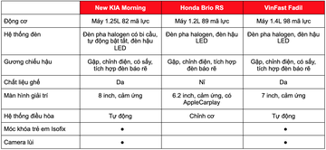 KIA Morning vừa mới ra mắt, có thiết kế nội/ngoại thất rất ấn tượng. Honda Brio có tiện nghi ít nhất, tuy vẫn đáp ứng được mức cơ bản ở trên. VinFast Fadil bán chạy nhất (18.016 xe trong năm 2020), động cơ lớn nhất dùng máy 1.4L. Cả 3 dòng xe có kích thước tổng thể, trục cơ sở tương đương nhau.