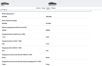Tùy thuộc vào biến thể thân xe và động cơ, phạm vi di chuyển theo tiêu chuẩn WLTP đã tăng lên tới 678km, tương đương tăng 175km hoặc 35% so với mẫu xe tiền nhiệm. Taycan mới không chỉ cần ít trạm sạc hơn trong những hành trình dài, mà thời gian sạc cũng nhanh hơn: tại các điểm sạc DC 800V, chiếc xe có thể sạc với công suất lên tới 320 kW, nhiều hơn 50kW so với trước đây.