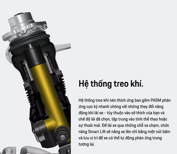 Tất cả các phiên bản tiêu chuẩn của mẫu Taycan nâng cấp đều được trang bị hệ thống treo khí nén chủ động. Tùy chọn Hệ thống kiểm soát khung gầm chủ động toàn thời gian Porsche Active Ride mới, có thể được đặt hàng cho các phiên bản dẫn động bốn bánh toàn phần, mang lại sự linh hoạt chưa từng có giữa sự tiện nghi sang trọng khi lái xe và các tình huống lái xe năng động.