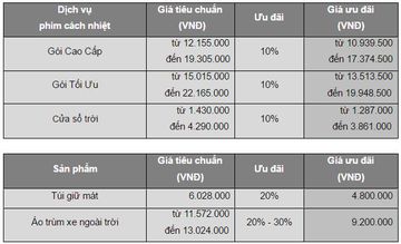 Bảng giá ưu đãi cho các gói dịch vụ và sản phẩm chăm sóc xe mùa nóng (đã bao gồm 10% thuế GTGT):