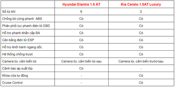 Danh sách tính năng an toàn trên 2 xe đều có hệ thống phanh ABS, EDB, BA, hệ thống cân bằng điện tử, hỗ trợ khởi hành ngang dốc, chống trượt. Elantra nhỉnh hơn khi nhiều hơn Cerato tới 4 túi khí, ngoài ra còn được trang bị thêm cảm biến áp suất lốp. Tuy nhiên, Cerato cũng có điểm mạnh riêng khi được trang bị hệ thống khóa cửa tự động, Cruise Control và cảm biến lùi trước/sau.