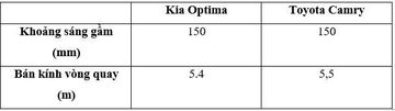 Mặc dù khi xét về kích thước tổng thể và chiều dài cơ sở, Toyota Camry có phần thua kém Kia Optima. Tuy nhiên xét về không gian nội thất, cả 2 đều mang lại cho hành khách sự rộng rãi khá tương đồng. Ngoài ra, do có cách sắp xếp hợp lý và ưu tiên cho không gian hàng ghế sau nên trên Camry, người dùng sẽ thoải mái hơn đôi chút.