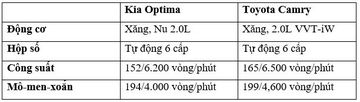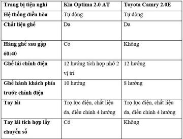 Qua một vài so sánh nhỏ ở trên, chúng ta có thể rút ra kết luận như sau: Nếu người mua mong muốn tìm kiếm một chiếc sedan hạng D với giá cả hợp lý hơn, thiết kế thời trang, trẻ trung hơn, nhiều trang bị tiện nghi, chỉ quan tâm tới giá trị hưởng thụ mà không quan trọng yếu tố thương hiệu thì Kia Optima sẽ là sự lựa chọn phù hợp. Ngược lại, nếu xác định đặt yếu tố thương hiệu và giá trị khi bán lại lên hàng đầu, muốn một chiếc xe có thiết kế chững chạc hơn, chú trọng sự thoải mái trong không gian nội thất cho cả gia đình, chấp nhận sự chênh lệch về mức giá để đổi về một chiếc xe bền bỉ với tiêu chí “ăn chắc mặc bền”... thì Toyota Camry 2.0E sẽ là sự lựa chọn đáng cân nhắc hơn.